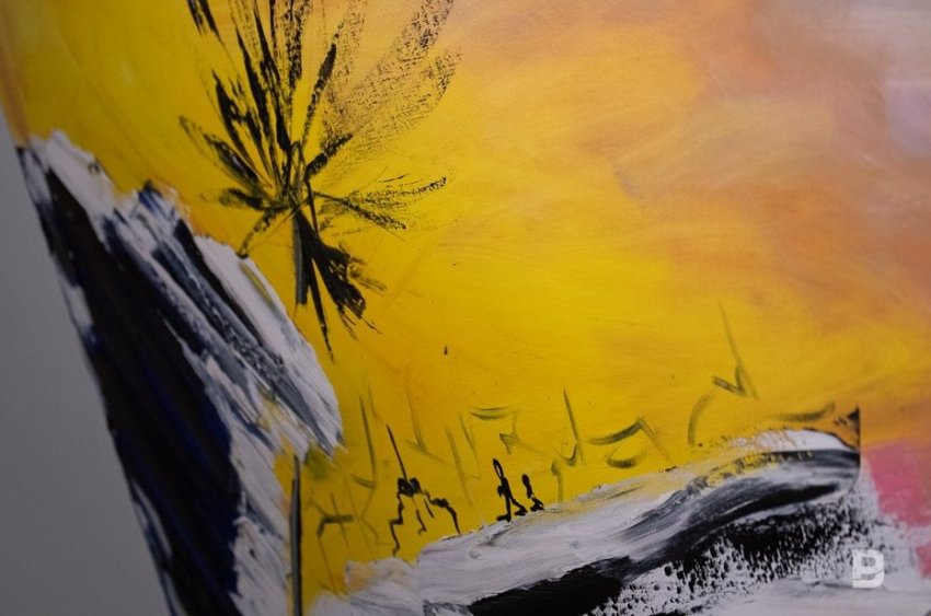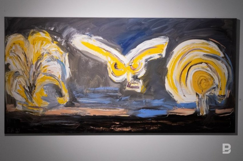 Первое, с чем сталкиваются посетители в выставочном зале, — стойкий запах свежих масляных красок. Действительно, зритель понимает, что все картины творились специально для Казани и совсем недавно — краска высохла, а запах выветриться не успел.