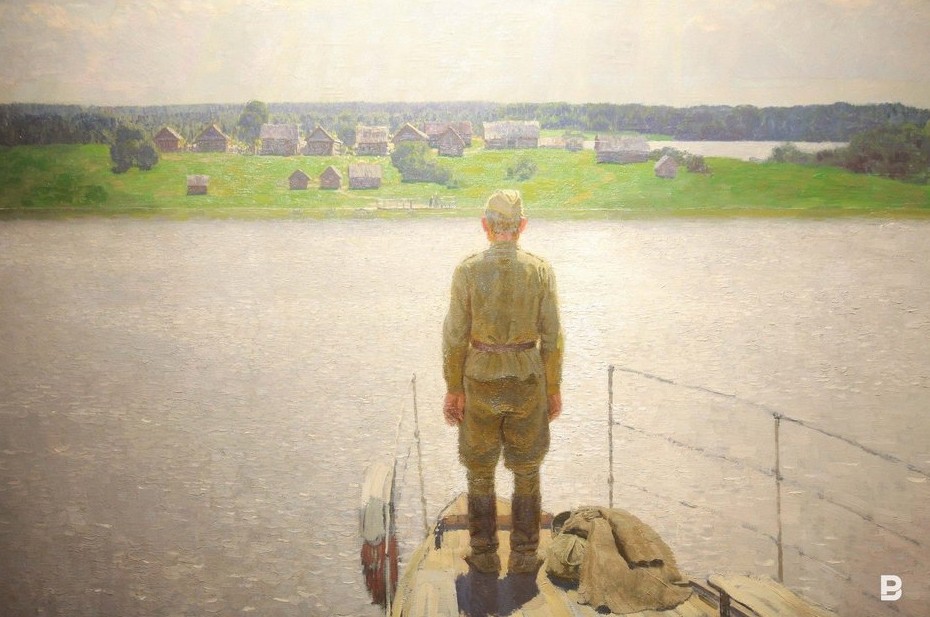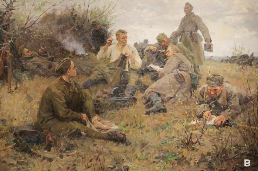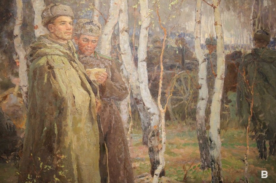 Еще четыре зала галереи заняла другая тематическая выставка из фондов музея — «И снова май…». Художники запечатлели моменты короткой передышки между боями, периоды затишья, когда солдаты отдыхали, писали письма родным на родину. Великая Победа, возвращение с поля боя, жизнь после войны — все эти сюжеты нашли свое отражение в полотнах художников.