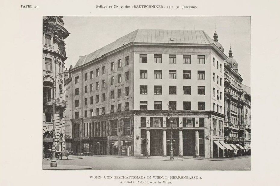 В 1909 году Леопольд Голдман объявил конкурс на строительство торгового здания для магазина высокой моды Goldman & Saltasch. Но победителя так и не выбрали, поэтому заказчик отдал проект Адольфу Лоосу. В 1910 году строительство приостановили из-за скандала. Общественность возмутила «непристойная нагота» верхней части фасада. Только после того, как Лоос согласился компенсировать эту наготу установкой цветочных ящиков, строительство возобновилось и было закончено в 1912 году. Жители Вены все равно невзлюбили Дом Лооса. Они называли его «домом без бровей» из-за отсутствия привычных навесов над окнами. Говорят, что император Франц Иосиф настолько не любил это здание, что после строительства избегал проезда через Михаэлерплац.