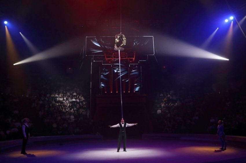 Номера нацелены на то, чтобы публика поразилась мощи и выносливости цирковых мастеров. Вот появляются эквилибристы на першах под управлением Николая Лакеева, то есть на длинных шестах, удерживаемых на голове, пока на другой стороне выполняются трюки. Валерия Шешукова летает на трапеции, причем каждый элемент ее хореографии кажется сверхопасным, а это так и есть.