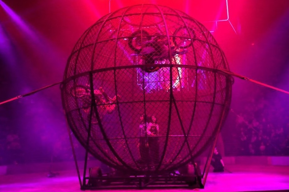 Что касается номера с тремя мотоциклами, безусловно, это пик программы. Пространство заполняется запахом бензина, внизу шара встают три девушки, два мотоциклиста носятся вокруг них. А финал — три водителя крутятся в крохотном, с точки зрения зрителей с верхних рядов, железном панцире, когда только и думаешь, сидя рядом с ребенком, чтобы ничего не случилось.