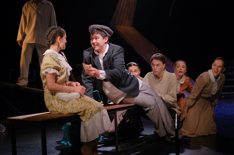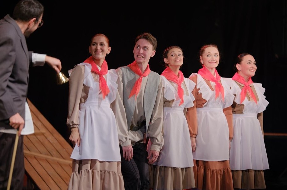 На сцену он выводит десять человек, у большинства из которых по 4—6 ролей. Благодаря программке мы можем узнать, например, что Алсу Шакирова играет Музу, Деревенскую женщину, Городскую женщину, Ответственного секретаря и Ученика. Но каждый раз основная часть актеров превращается еще и в своеобразный хор, и в хореографическую группу из Муз и Вдохновений (танцы ставила Елена Музеева).