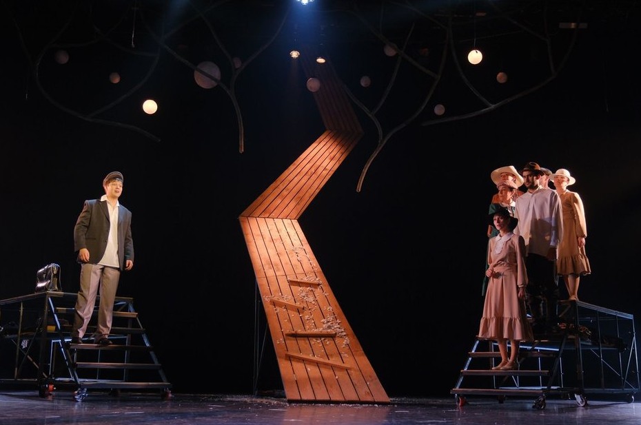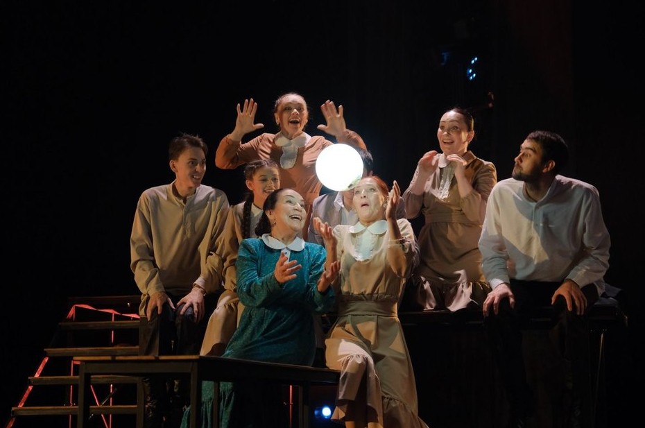 Сцена заполнена помостами, а в центре лестница ведет на самый верх, подсвеченный шарами. Музыка Ильяса Камала сходу задает сентиментальный тон. И актеры начинают путешествие через 12 отрывков — от детства до старости.