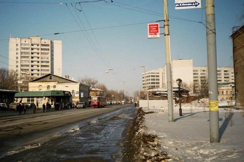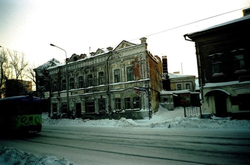 Слева уходит в землю средовой дом, на месте которого сейчас находится новострой. А трамвай на фото в той же цветовой гамме, что и комплекс мещанина Шакирзяна Шамсутдинова — доходный дом и кирпичный особняк.
