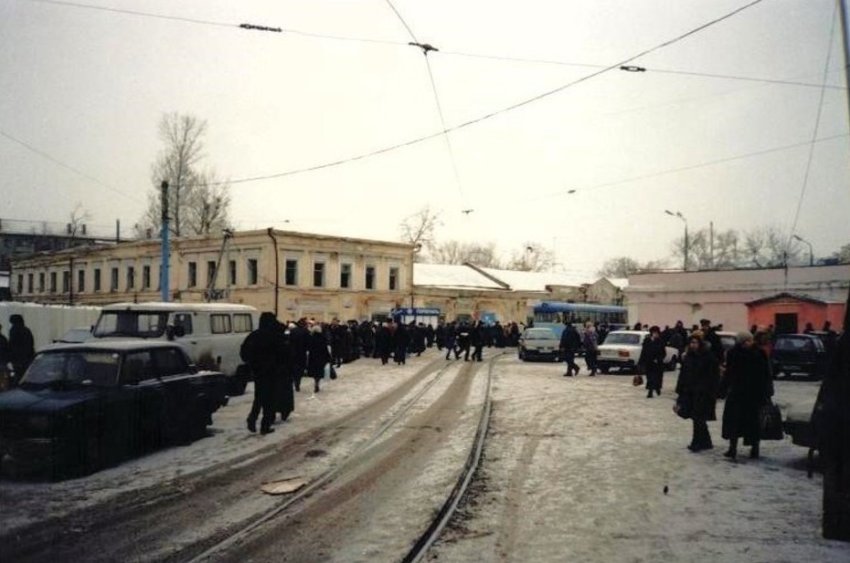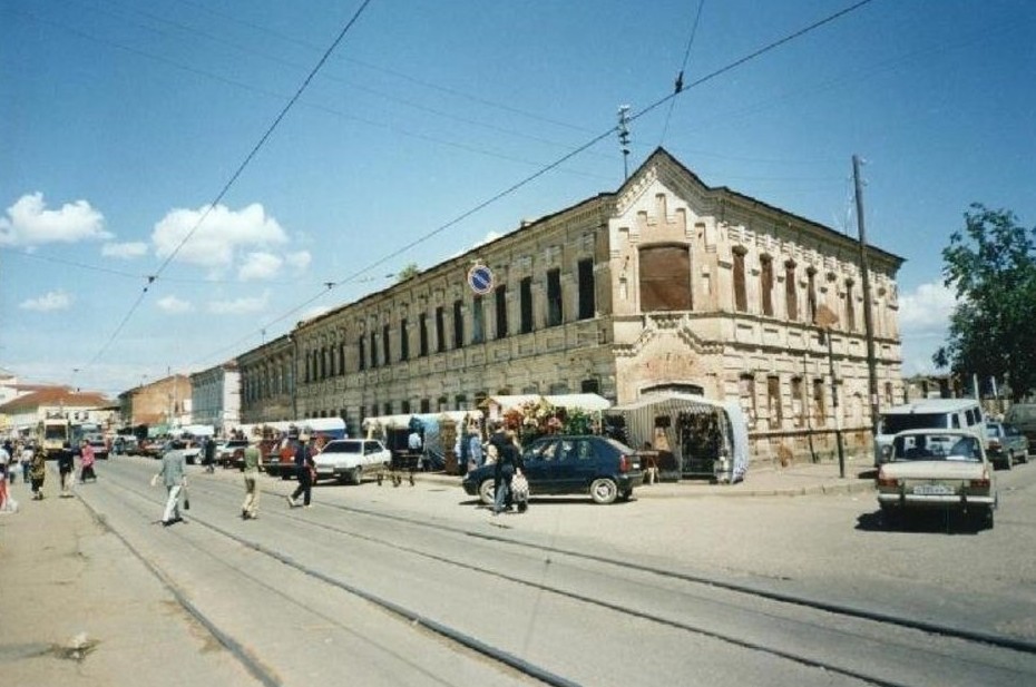 Как мы видим, здание законсервировано и ждет своего часа. А тротуары заняты палатками — начинается огромная территория Колхозного рынка и связанной с ним уличной торговли. Машины закрывают единственный проезд, так что пробраться отсюда к вокзалу проблематично. Сейчас на здании висит табличка: «В сентябре 1833 года проездом в город Оренбург остановился великий русский народный поэт А.С. Пушкин». Это, конечно, неправда, Солнце русской поэзии бывало в гостях у Карла Фукса, чей дом стоит на Галиаскара Камала, но на углу с Московской. Ошибку исправить не могут до сих пор.
