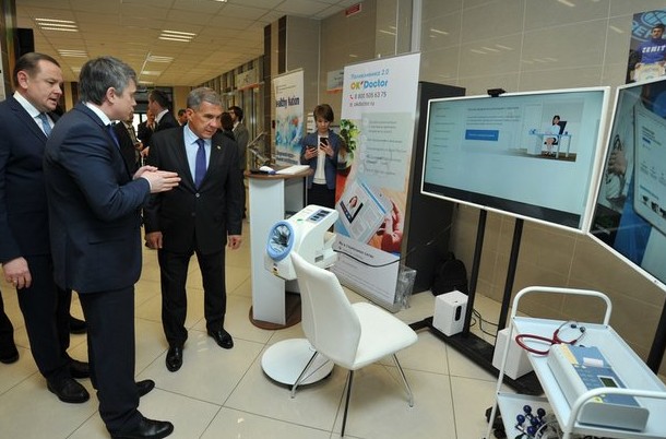 Коллегия Минздрава началась с выставки медицинских достижений. Рустама Минниханова сразу взял в оборот руководитель онлайн-клиники. Почему бы и нет? Президент США медосмотр прошел, президент России окунанием в прорубь и безупречным торсом доказал, что проблем со здоровьем у него нет. Очередь за президентом Татарстана. Минниханова усадили измерять давление, результаты через интернет поступают доктору, который может находиться в любой точке мира, в этот раз в Санкт-Петербурге.