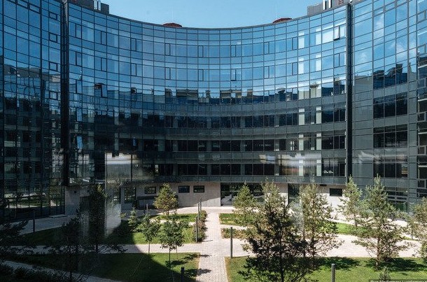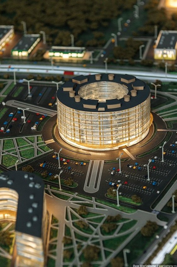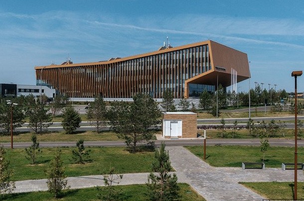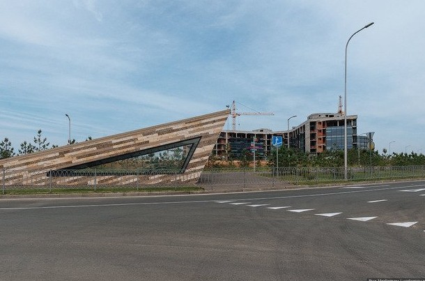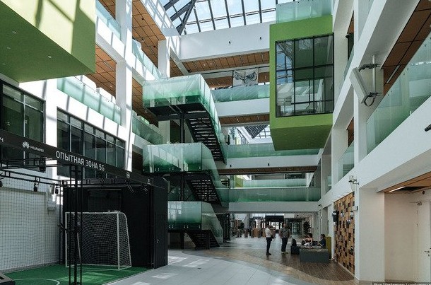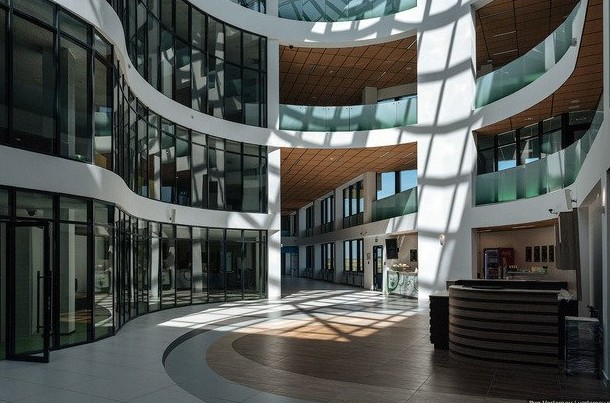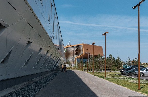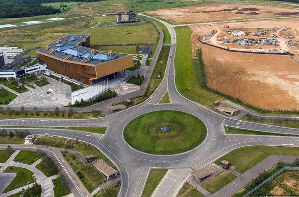 За три года была построена практически вся инфраструктура города Иннополиса. Были построены основные объекты: здание технопарка, здание университета, спорткомплекса, медицинского центра, вся жилая инфраструктура. Круглое здание — это технопарк, с которого мы начнем экскурсию. По сути просто офисное здание, где компании могут арендовать площадь. Здесь предусмотрено более 2000 рабочих мест.