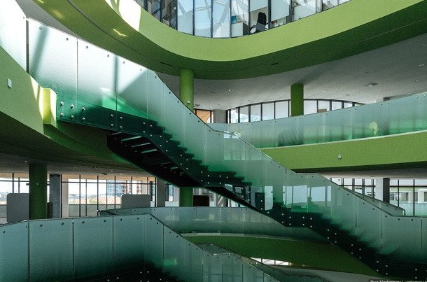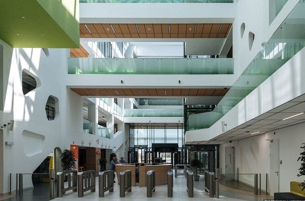 А вот внутри все шикарно! По сути, весь университет — это один большой атриум, который соединен с общежитием. Студенты могут даже не выходить на улицу и приходить на пары в тапочках. Обратите внимание на парящие в воздухе переговорные комнаты.