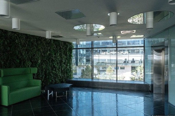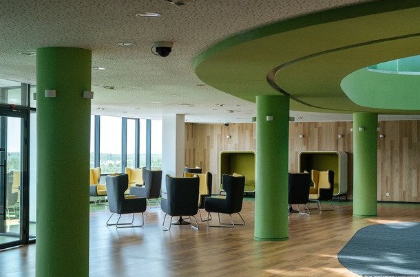 Зеленые стены, панорамное остекление. Образу будущего тут уделили много внимания.