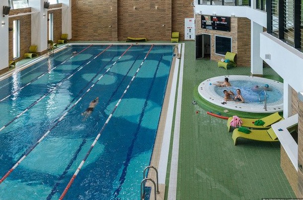 Внутри бассейн, банный комплекс, тренажеры и кардио-залы, а также зал для игровых видов спорта.