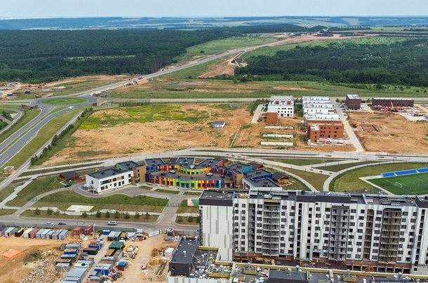 Вид сверху. Построено еще очень мало. Но тут хорошо видно бестолковое планирование. Широченные дороги, вдоль дорог какие-то пустыри, которые никому не нужны, их нельзя использовать, потом парковки. Все очень рыхло, ощущения города нет.