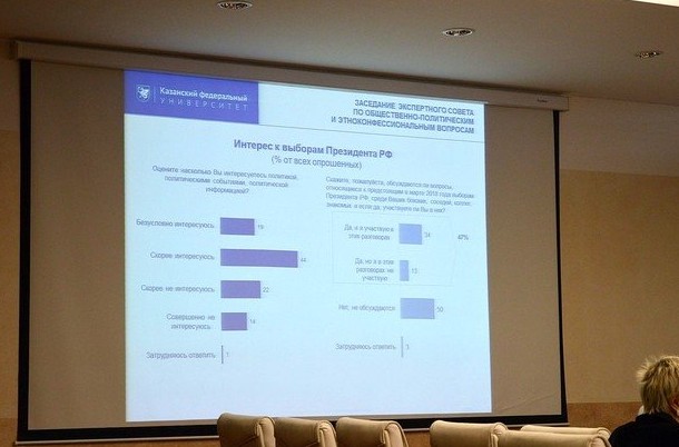 Руководитель Управления социально-политических исследований ВЦИОМ Кирилл Родин остановился на электоральных предпочтениях татарстанских избирателей. Интерес к выборам президента РФ проявляет 53%. Точно примут участие 65% опрошенных (в РФ — 52%), скорее примут — 21%.