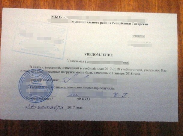 По словам лидера учительского профсоюза Юрия Прохорова, некоторые директора уже воспользовались бланками и вручили такие уведомления педагогам.