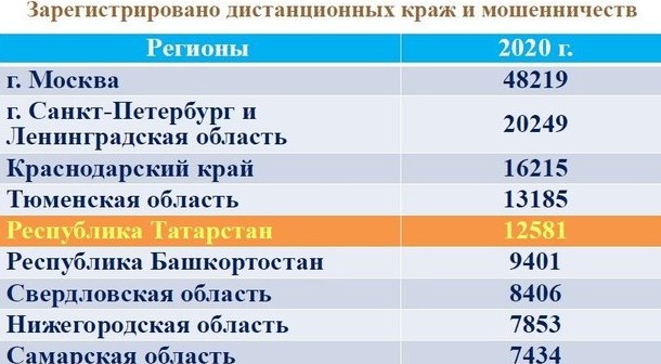 Наступивший 2021-й в МВД Татарстана объявлен Годом борьбы с преступлениями в сфере информационных и телекоммуникационных технологий. В переводе — с дистанционными кражами средств с банковских счетов и мошенническим хищением средств путем «развода» по мобильной связи и интернету. За три года их количество в Татарстане утроилось. Причем в общем массиве всех зарегистрированных преступлений каждое четвертое — дистанционное хищение. Хуже ситуация лишь в Москве, Санкт-Петербурге и еще ряде регионов.