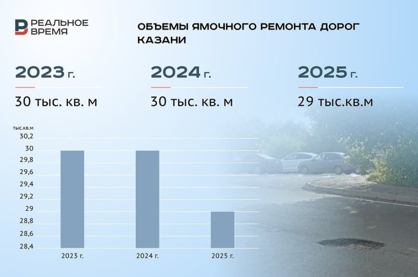 Ямочный ремонт казанских дорог в 2025 году был запланирован в объеме, который почти не меняется уже много лет: 29 тыс. кв. м, на 1 000 «квадратов» меньше, чем в предыдущие два года. При этом по традиции часть ям, о которых упомянуто выше, вниманием обошли, а часть «запломбировали» так, что от ремонта к концу лета мало что осталось.
