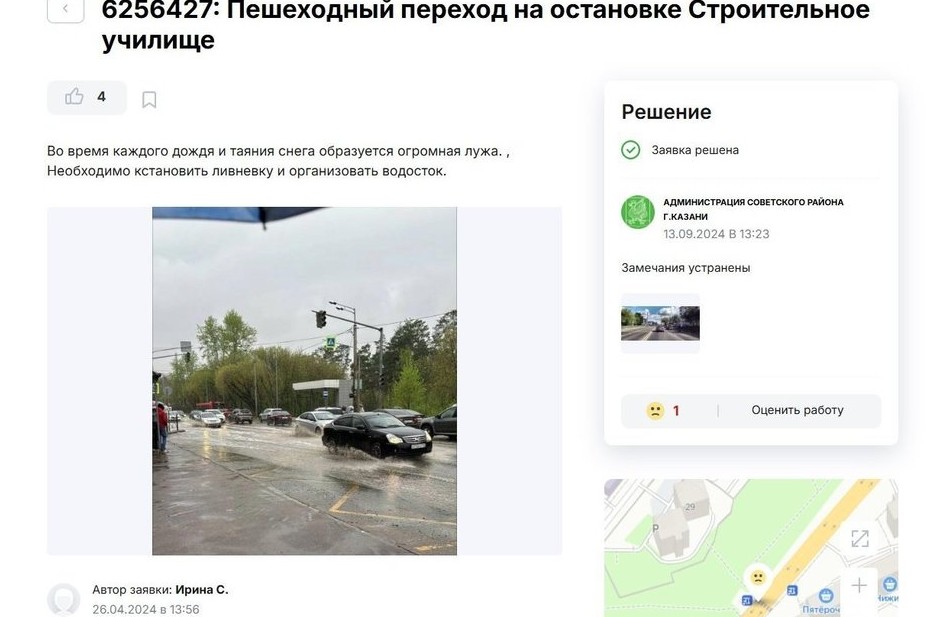 Она приложила выразительную фотографию, на которой видна лужа глубиной выше щиколотки и шириной в дорожную полосу. Но чиновники из райадминистрации дождались, когда вода спадет, и сделали свой снимок. Ответили: «Участок, указанный в обращении, находится в удовлетворительном состоянии».