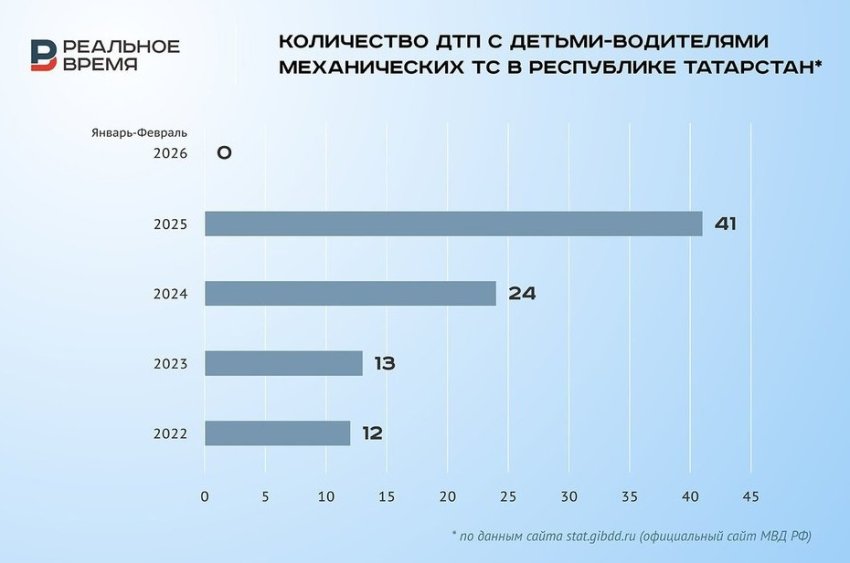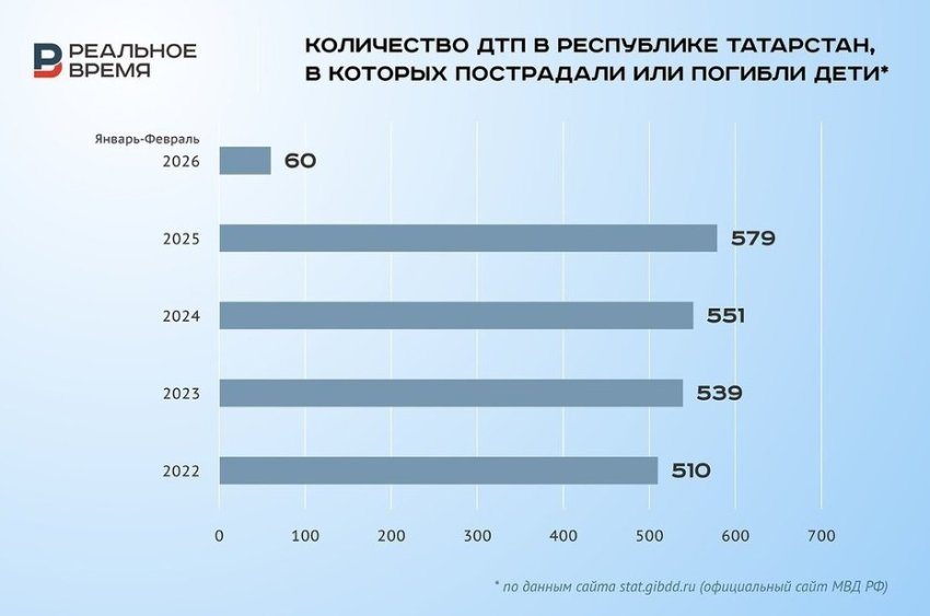 Количество ДТП с участием детей, произошедших из-за нарушения водителями Правил дорожного движения, в России в январе — феврале 2026 года упало по сравнению с двумя первыми месяцами 2025 года на 20,7%, а в РТ выросло на 42,5%.