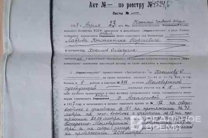 Сарпова рассказала изданию историю этого земельного участка. В 1927 году Казанский городской отдел коммунального хозяйства предоставил Самигулле Хакимову по договору 9,3 сотки пустующей земли на улице Мыловаренной (ныне — ул. Фаткуллина). Земля тогда не передавалась в собственность, а предоставлялась под застройку. Через год, в 1928 году, было заключено дополнительное соглашение к договору застройки, согласно которому право застройки участка предоставлялось уже двум гражданам — Самигулле Хакимову и Шагимардану Шакирову. В итоге оба застройщика возвели на участке отдельные строения — жилые дома с хозяйственными постройками, которые в документах фигурировали как единое домовладение, в котором Хакимову и Шакирову принадлежало по ½ части.