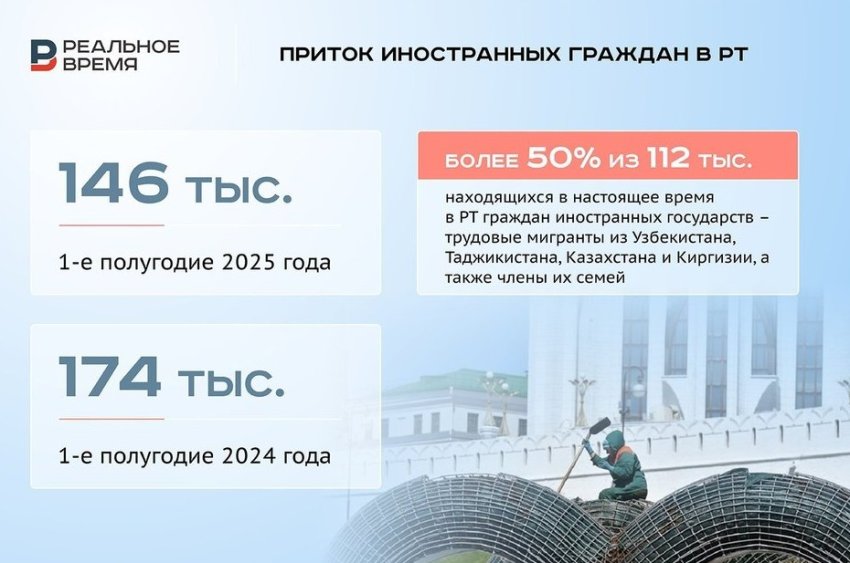 По статистике, Татарстан занимает ведущее место по числу мигрантов в стране, при этом около 80% из них — граждане среднеазиатских республик. Как сообщили «Реальному времени» в МВД по РТ, с начала 2025 года в Татарстан въехало более 146 тысяч иностранных граждан — на 19% меньше, чем за аналогичный период 2024 года.