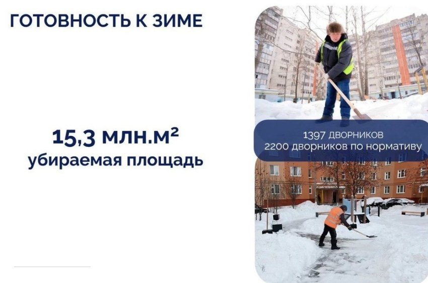 По данным исполкома, крупные управляющие компании (УК), обслуживающие 4 200 многоквартирных домов, располагают штатом из 1 397 дворников. На них возложена задача по уборке придомовых территорий общей площадью 15,3 млн кв. м. При этом нормативная потребность в работниках для выполнения этих задач оценивается почти в 2 200 человек.