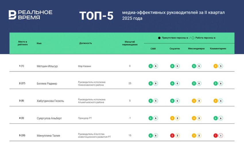 Пятерку замкнула еще один новичок рейтинга — руководитель Агентства инвестиционного развития РТ Талия Минуллина. Ее упоминаемость выросла в два раза, а показатель впервые достиг 2000 баллов. Естественно, на ее позиции повлиял майский KazanForum 2025, где главная по инвестициям в республике была одним из хедлайнеров.