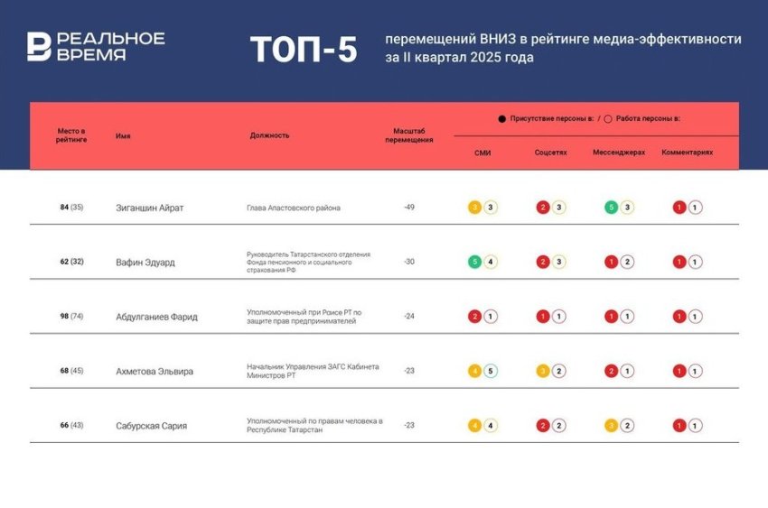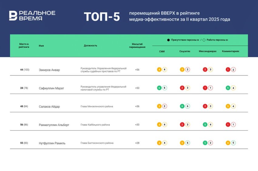 Сразу на 56 пунктов взлетел руководитель Управления Федеральной службы судебных приставов по РТ Анвар Закиров, который в прошлом рейтинге был в числе аутсайдеров. На это, как отмечают составители рейтинга, повлиял приход нового пресс-секретаря. Во втором квартале в отличие от первого ведомство было активным и провело сразу два прямых эфира и брифинг.