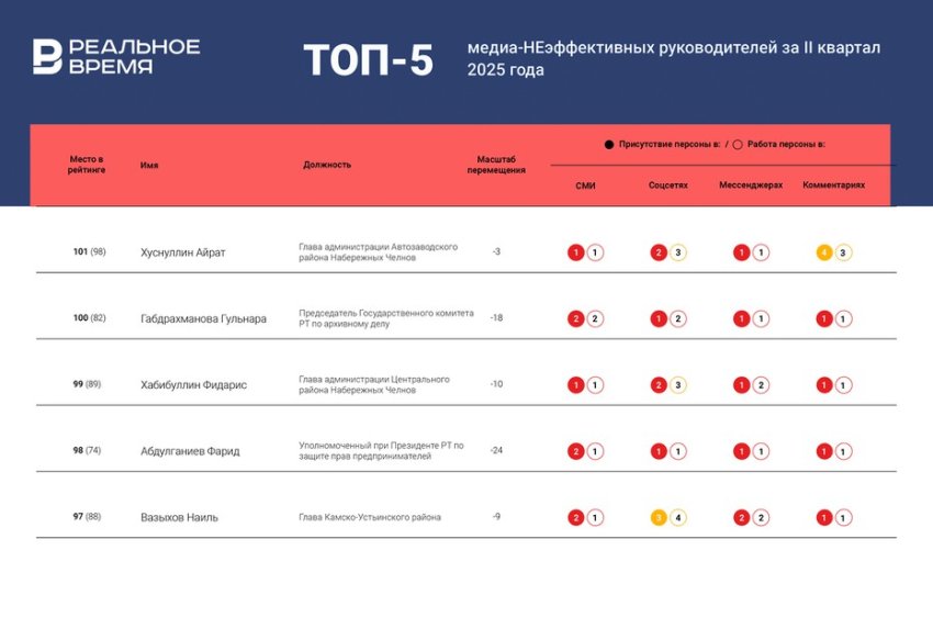 Снизила свои позиции (-23) и начальник Управления ЗАГС РТ Эльвира Ахметова. Во втором квартале 2025-го ее только назначили, поэтому никакого личного негатива тут нет. Однако серьезно повлияло освещение в СМИ судебного процесса в отношении бывшего руководства ЗАГС.