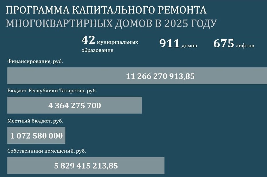 В программе капремонта участвовали 911 домов в 42 муниципальных образованиях. В качестве отдельного достижения министр выделил замену лифтов, под которую в 2025 году попали 675 подъемников в МКД, тогда как ранее ежегодно меняли порядка 300. Это удалось благодаря дополнительному траншу от правительства республики в 2 млрд.